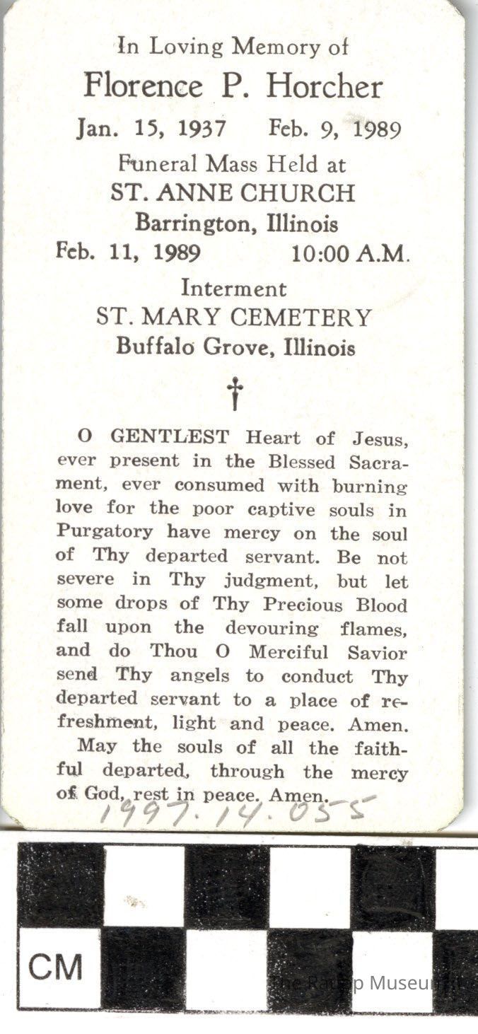 One (1) funeral prayer card for Florence P. Horcher, born 01/15/1937 and died 02/11/1989. On one side is an obituary and prayer in English. On the other side is a color picture of Jesus depicted as a shepherd, standing in a field next to a stone wall, holding a wooden stick, with a white and green cloak on, a halo, and golden round necklace tablet.