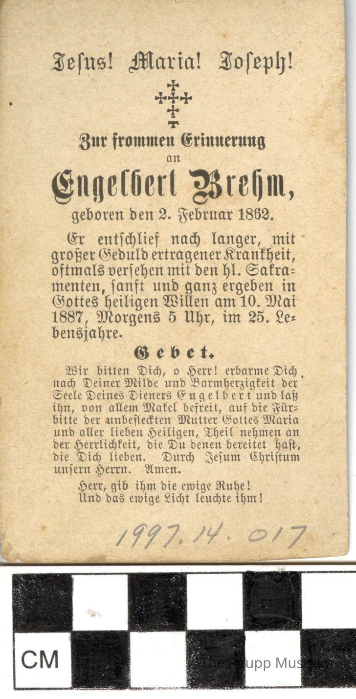One (1) funeral prayer card for Engelbert Brehm, born 02/02/1862, and died 05/10/1887. On one side is an obituary and prayer in German with a cross on top. On the other side is a black and white picture of the Virgin Mary in a cloud with a star halo and standing on the moon, with German scripture below it.Archive Details