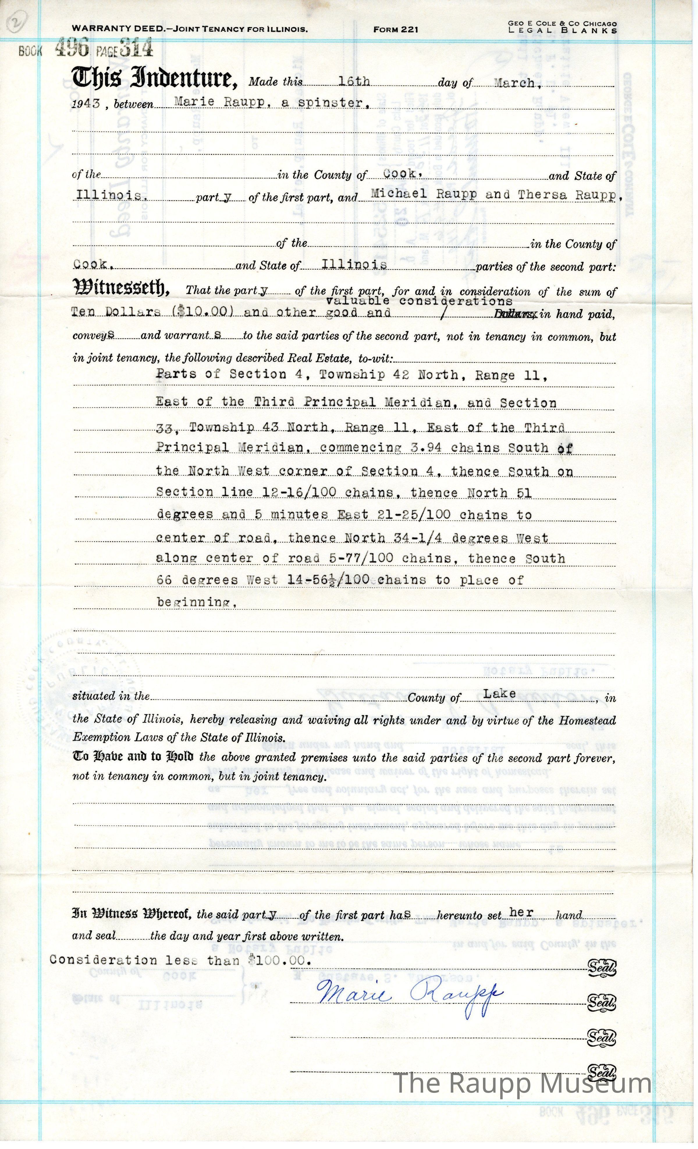 One (1) page double sided Warranty deed between Marie Raupp and Michael and Theresa Raupp on March 16, 1943.  The deed documents the sale of land for $10 in "parts of section 4, Township 42 North . Range 11..." in Lake County. The back side has the seal and a paragraph from the Notary Public and the title information (when document is folded).Archive Details