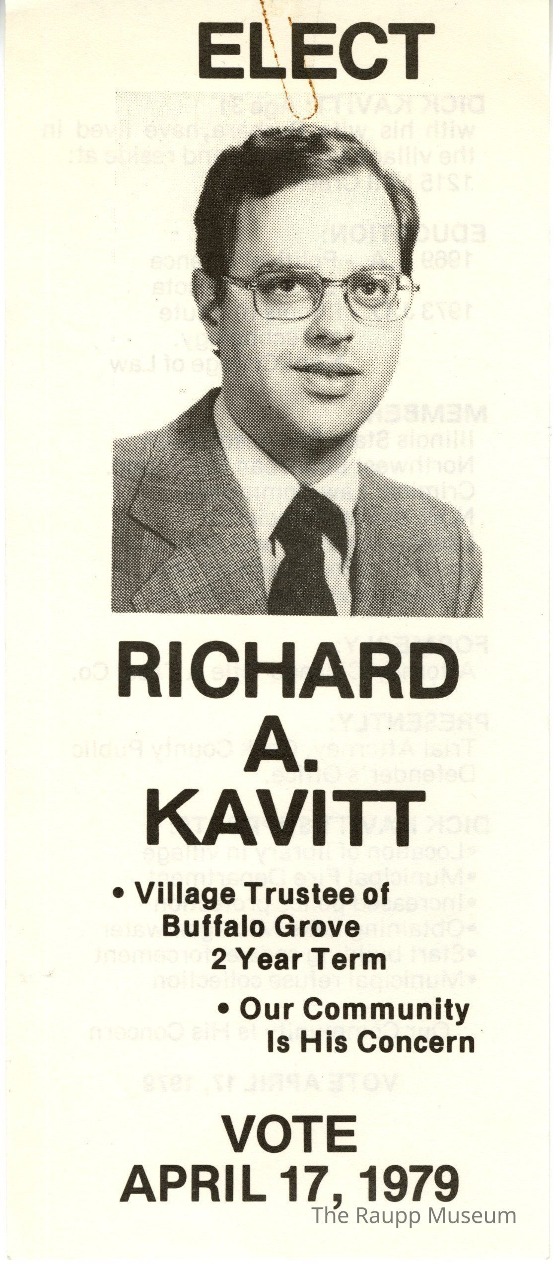 One (1) double sided bookmark election pamphlet for Richard Kavitt for BG village trustee.