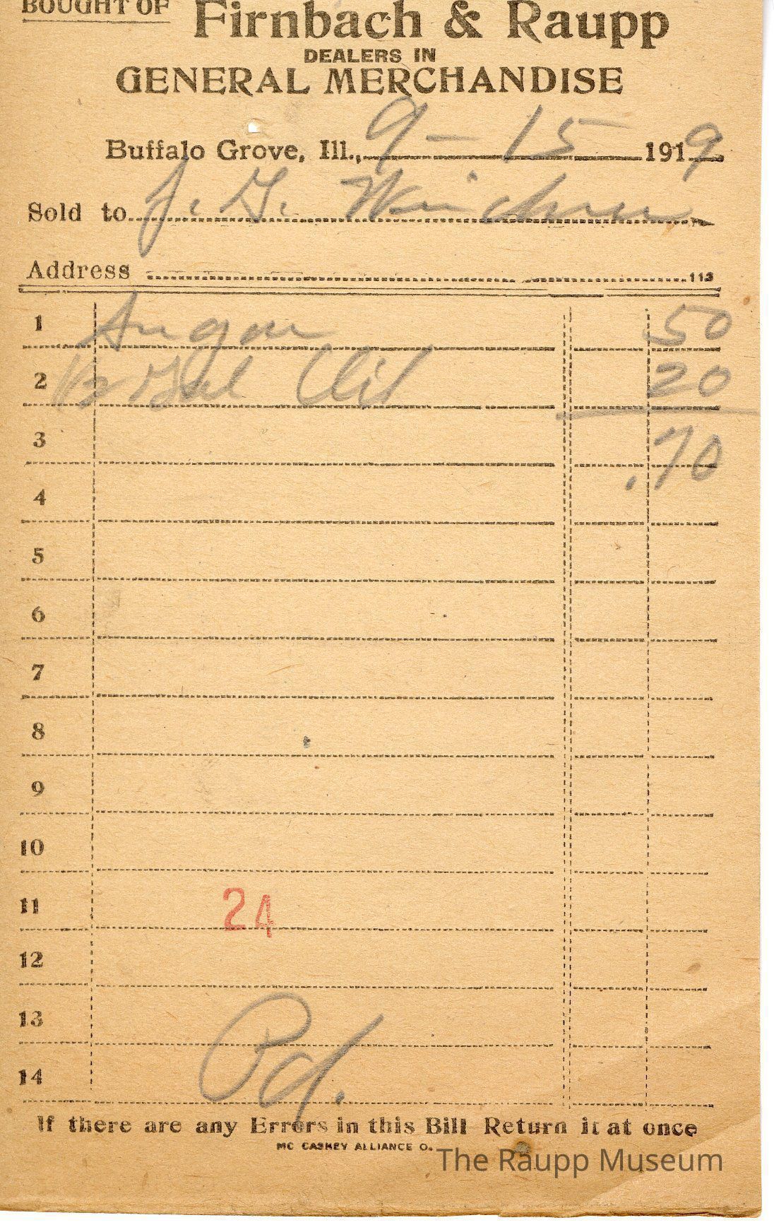 The black text is as follows, from top to bottom: Bought of Firnbach & Raupp; Dealers in GENERAL MERCHANDISE; Buffalo Grove, Ill.; Sold to; Address; If there are any Errors in this Bill Return it at once; MC CASKEY ALLIANCE O.Archive Details