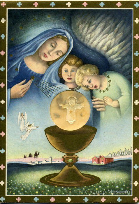 Color quad-folded Catholic greeting card produced by the Monastery of the Precious Blood in Brooklyn for the Christmas season. The front has a gold border with pink and blue crosses in it around image of angels looking down at a gold cup with circular cut-out window with a white paper Jesus reliquary insert in it.