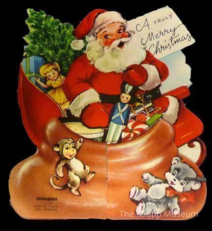 Color greeting card with images on the front and back. The front has an image of Santa standing in a sleigh with a talk bubble “A truly merry Christmas.” The back of the card has elves standing around a sack of toys holding signs “From Aunt E. Rubin” with Santa in the baackground. The card opens at the sack on both sides adn folds out into a brown tissue honeycomb.Archive Details