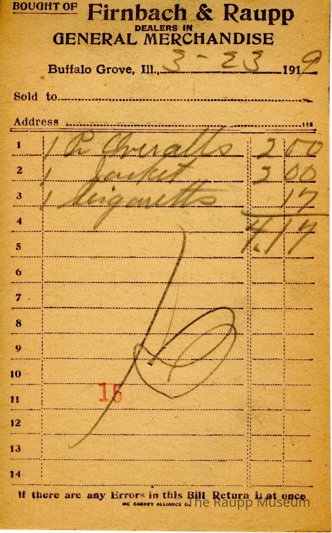 The black text is as follows, from top to bottom: Bought of Firnbach & Raupp; Dealers in GENERAL MERCHANDISE; Buffalo Grove, Ill.,; Sold to; Address; If there are any Errors in this Bill Return it at once; Mc Caskey Alliance O.Archive Details