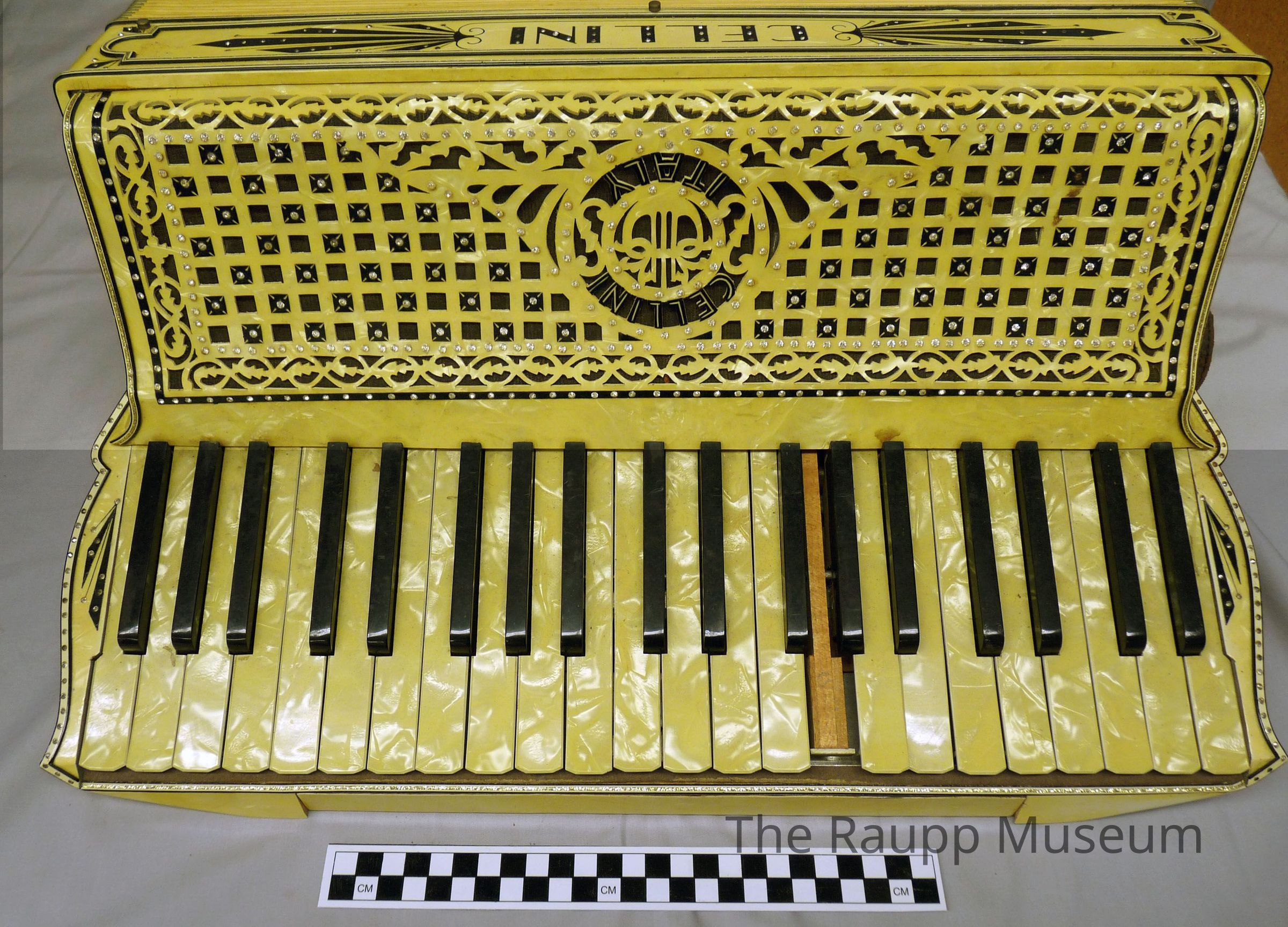 Accordion, yellow celluloid casing with mother-of-pearl finish and leather straps. Bellows separate a box piano keyboard and other box shape with six rows of white buttons. Casing has rhinestones and glitter trim border. Small decorative wood scrollwork and rhinestones in front of mesh. Also with celluloid grid perforations for sound amplification. Mesh behind it. Case cover missing from keyboard G-key.Dimensions