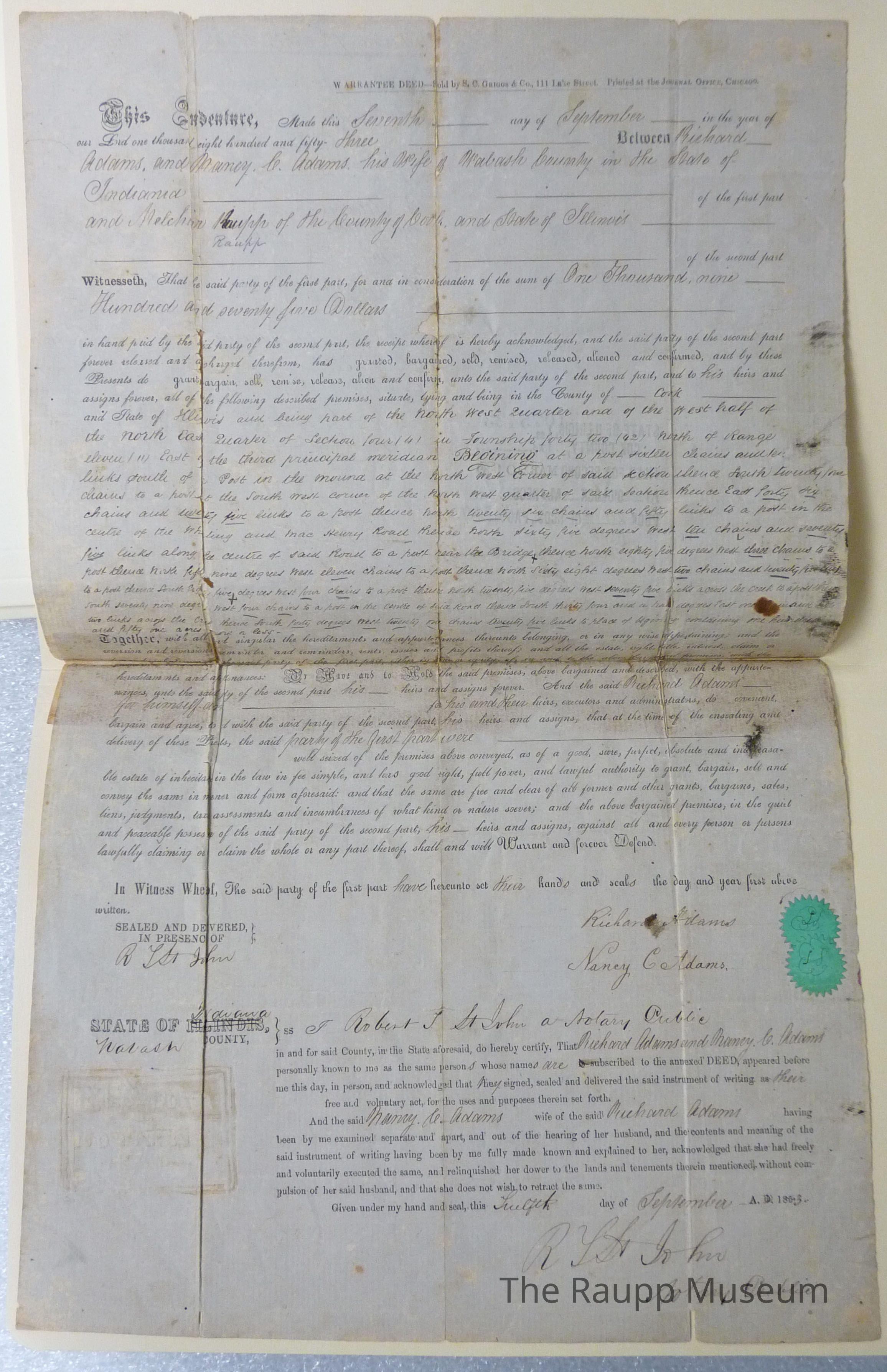 One (1) warranty deed between Richard and Nancy Adams and Melchior Raupp for land in Cook County for $1975.00. Page is blue with a mixture of printed and handwritten text in brown ink. There are two green stamps on the bottom right and signatures on the bottom. On the back is printed and handwritten notes summarizing the deed and when it was filed.Archive Details
