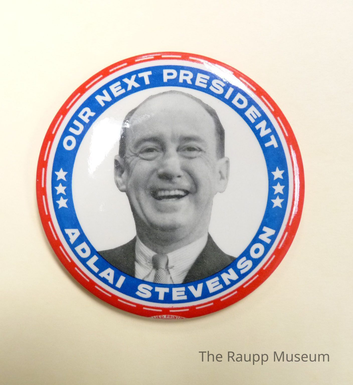 One (1) round red, white, blue election pin for Adlai Stevenson. Pin has a black and white photo of Adlai Stevenson smiling, pictured from the neck and up. There is a blue banner around that "Our Next President Adlai Stevenson", with a red banner around that. The back is brown with a sharp straight pin.Dimensions