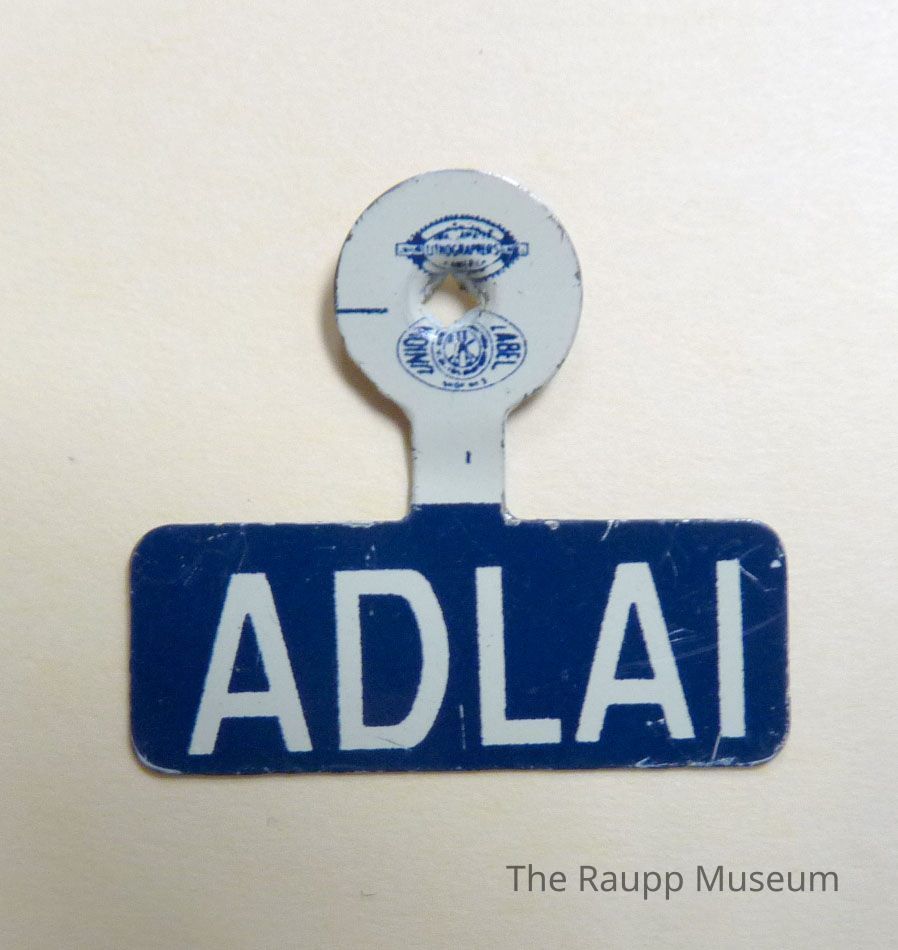 One (1) blue and white metal pin for Adlai Stevenson presidential election. The pin is a blue rectangle with white lettering "Adlai", with "adlai" slightly offcenter toward the bottom right. Attached on the top is a white circle that folds down the back to hold the pin on clothing. The circle has a blue "Union Label" label on it. There is a hole in the center. The back is silver metal.Relationships