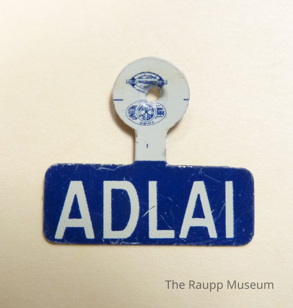 One (1) blue and white metal pin for Adlai Stevenson presidential election. The pin is a blue rectangle with white lettering "Adlai", with "Adlai" offcenter, slightly toward the bottom. Attached on the top is a white circle that folds down the back to hold the pin on clothing. The circle has a blue "Union Label" label on it. There is a hole in the center. The back is silver metal.Relationships