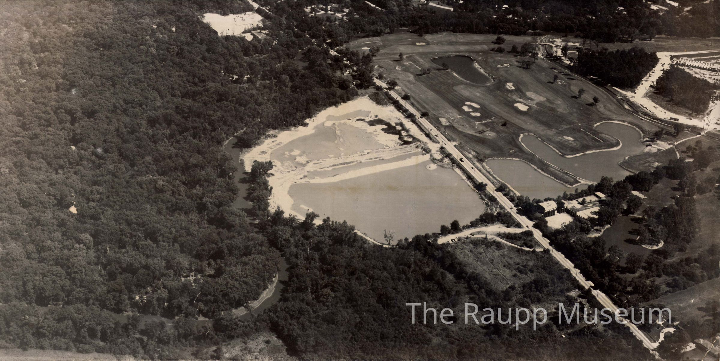 One (1) black-and-white aerial photograph of Buffalo Grove dated August 14, 1974. The image is bisected by a road running diagonal from top-center to bottom right. Right of the road is a golf course and a few houses. Left of the road is an artificial lake surrounded by white dirt or sand. Left of the lake is forest.