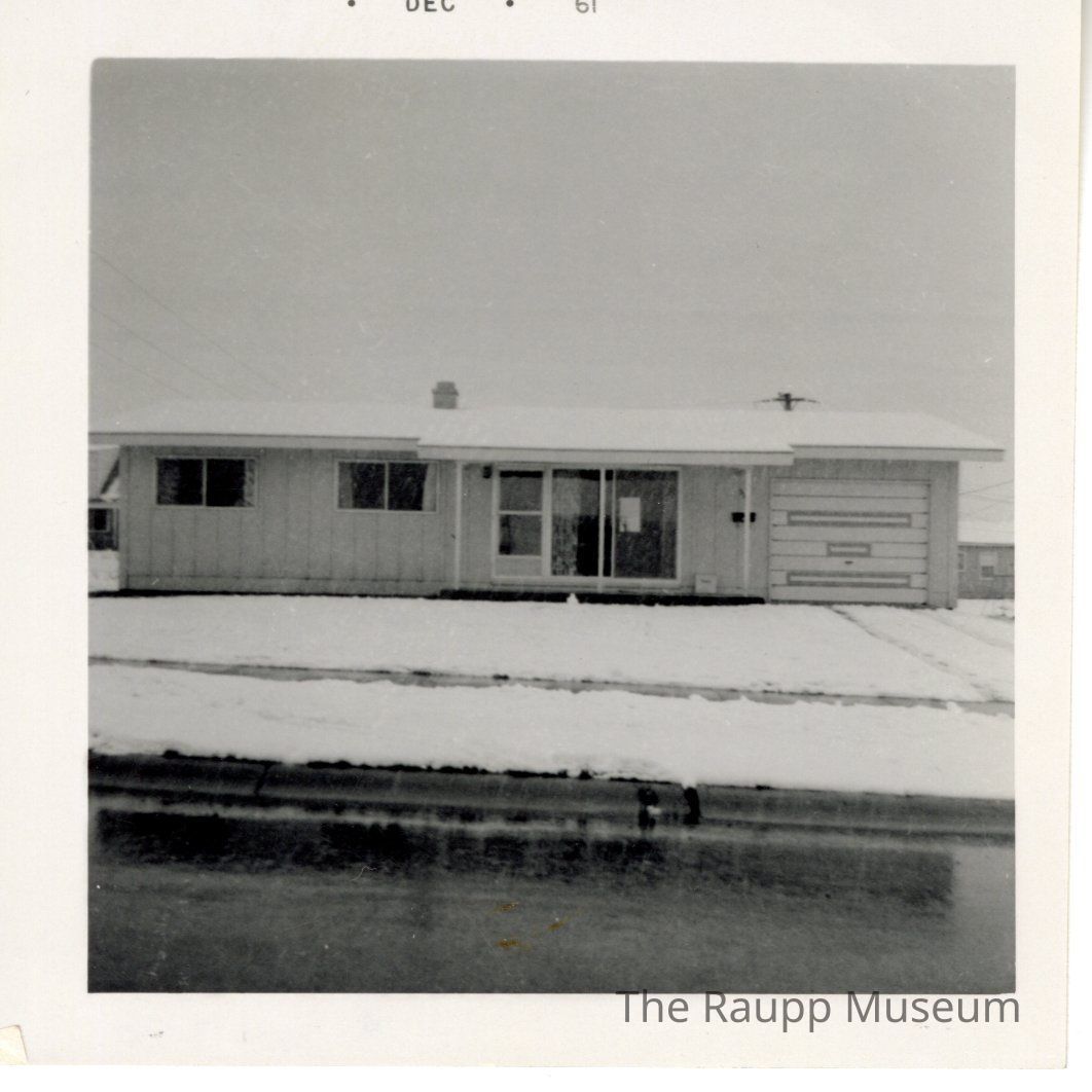One (1) black and white photo of a single story home, from the street. There is snow in front. Light colored panel, two windows, door, attached garage. Similar to .028/.039.Dimensions