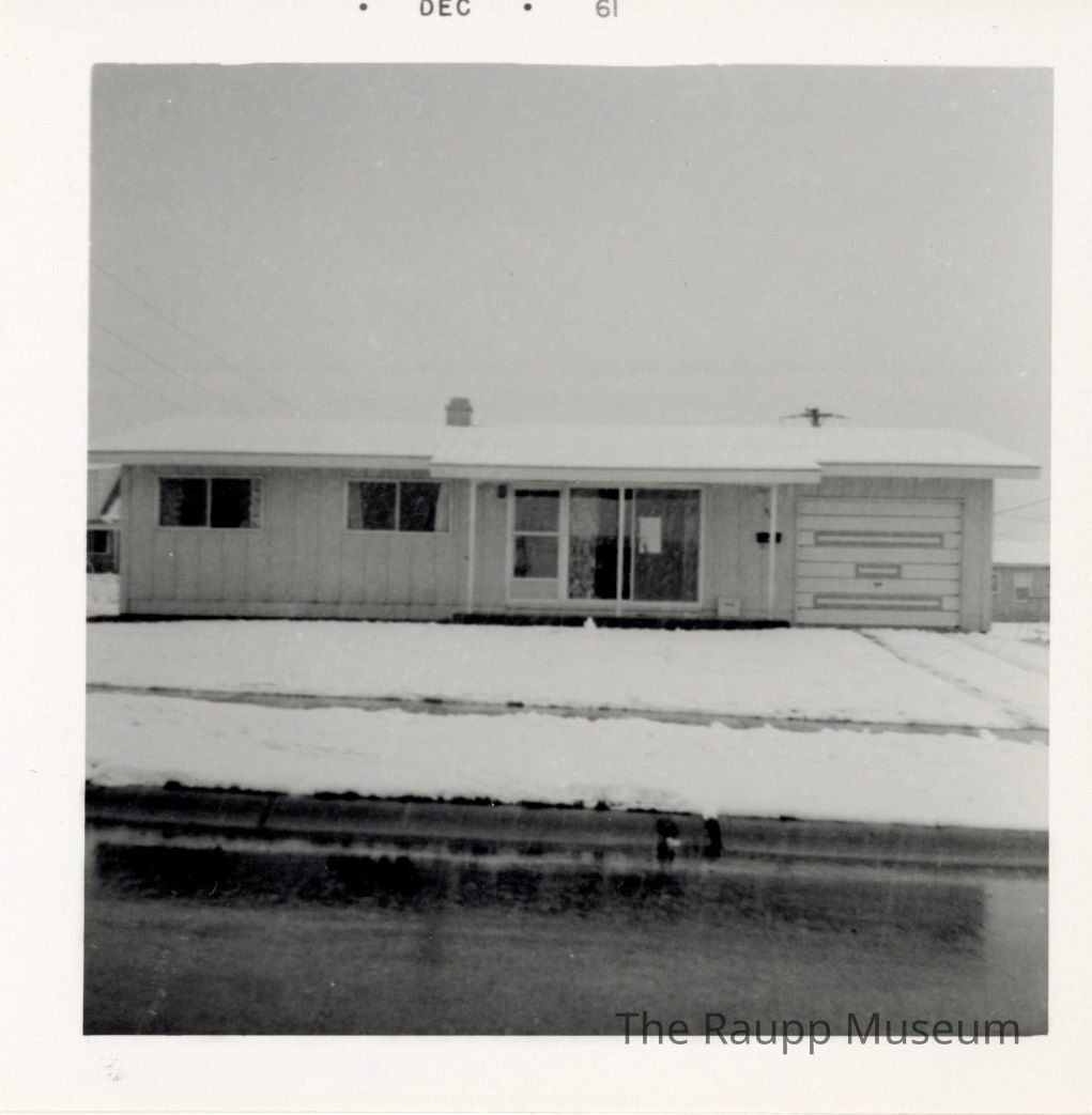 One (1) black and white photo of a single story home from the street. There is snow in front. Light colored panel, two windows, door, and attached garage. Identical to 2004.13.025Dimensions