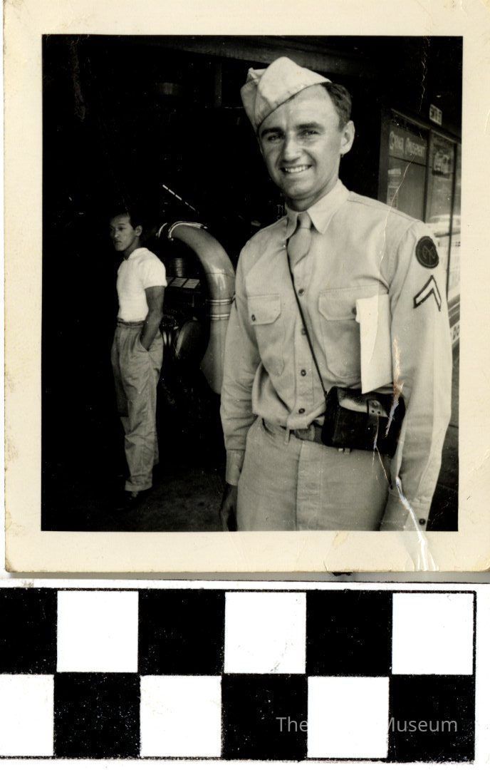 One (1) black and white photograph of PFC Albert Emmerich. He is standing on the right side of the photo, witha khaki uniform on and hat, including a black side bag and holding a folder under his left arm. To his right and behind is a man with black hair, white shirt and khaki pants. Albert is standing in front of vending machines and a jukebox.Dimensions