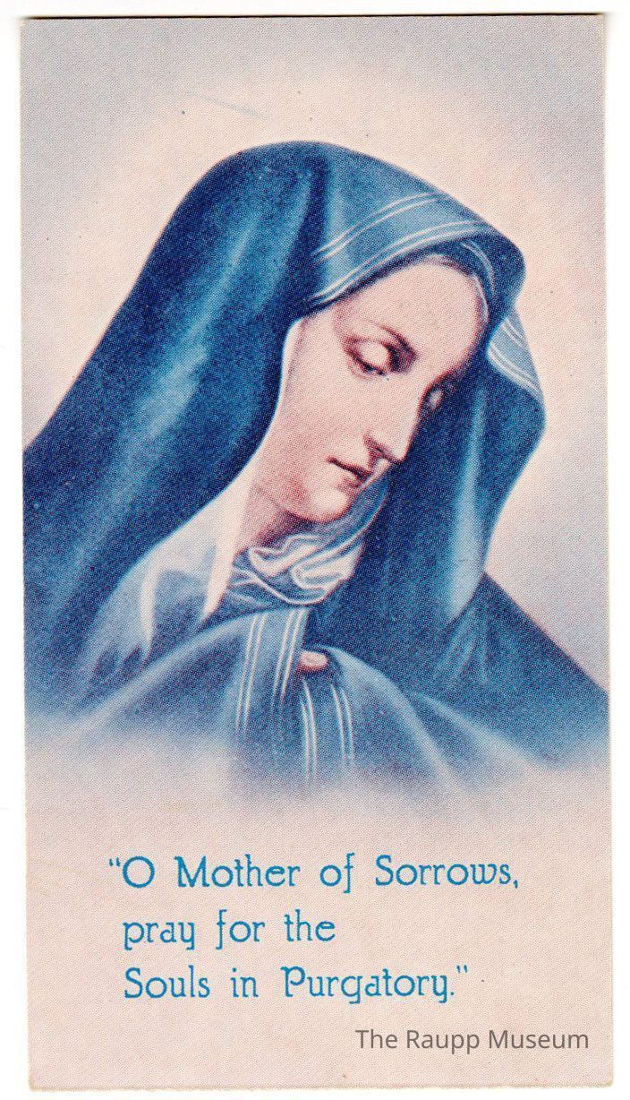 One (1) double-sided funerary card for Albert Fournier. The front has a color drawing of a woman with a blue cloth wrap looking downward. On the bottom is written "O Mother of Sorrows, pray for the Souls in Purgatory". On the back is printed in black a prayer for Albert Fournier.