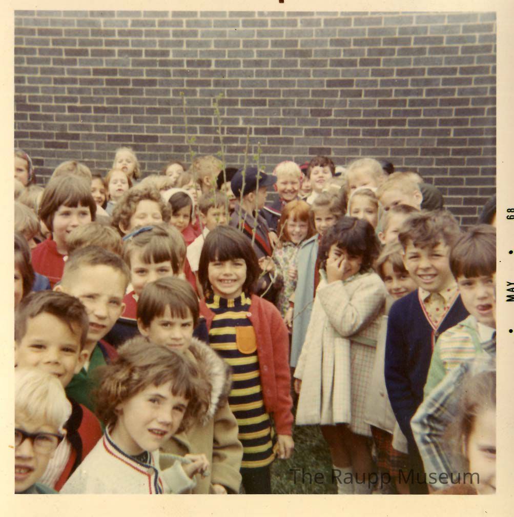 Color photo with white border. Photo of children gathered around a small tree outside of Alcott School. Back of photo indicates the students are first graders. Dated on right border: "May 68." Printed on Kodak paper.Made/Created