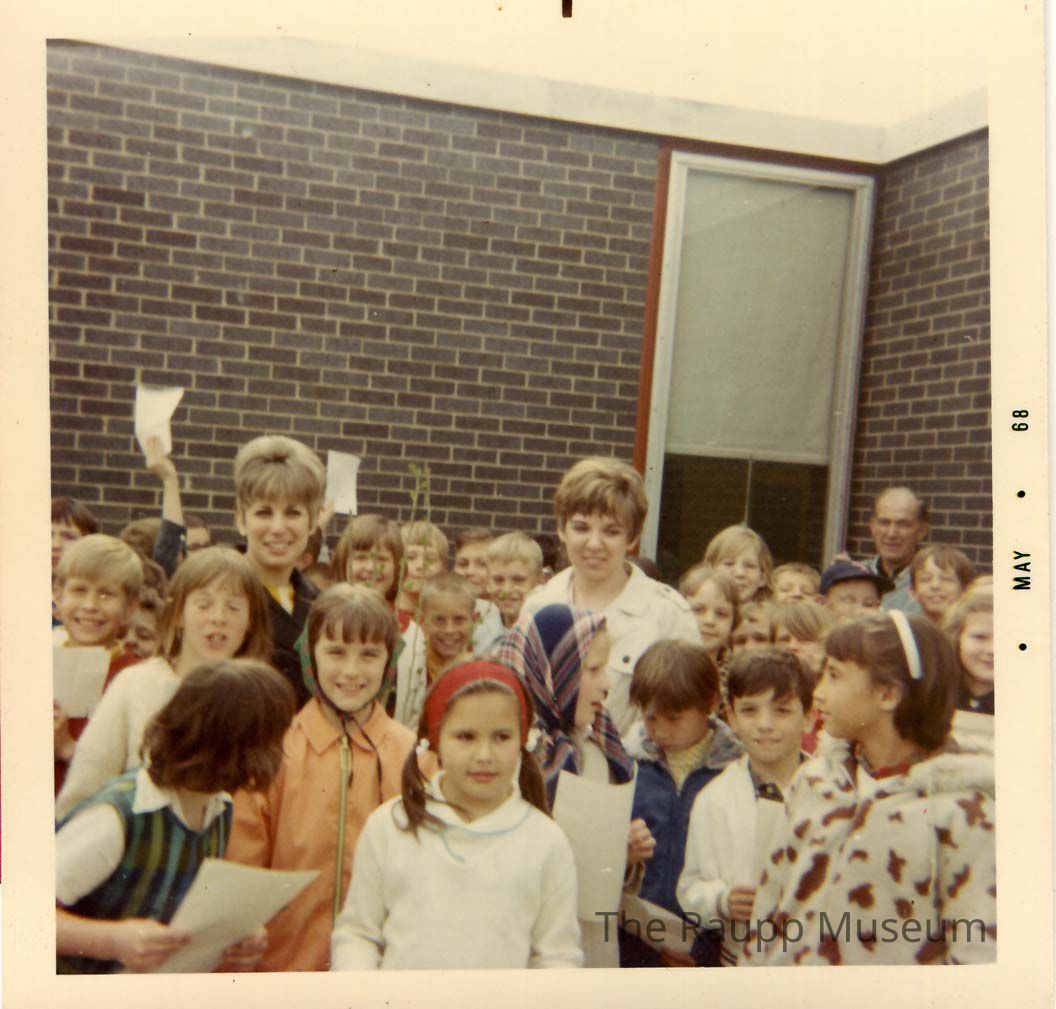 Color print with white border. Photo of children and adults standing around a small tree outside of Alcott School. Back of photo suggests Sue Milstone and Polly are pictured with third grade class. Dated on right border: "May 68." Printed on Kodak paper.Made/Created