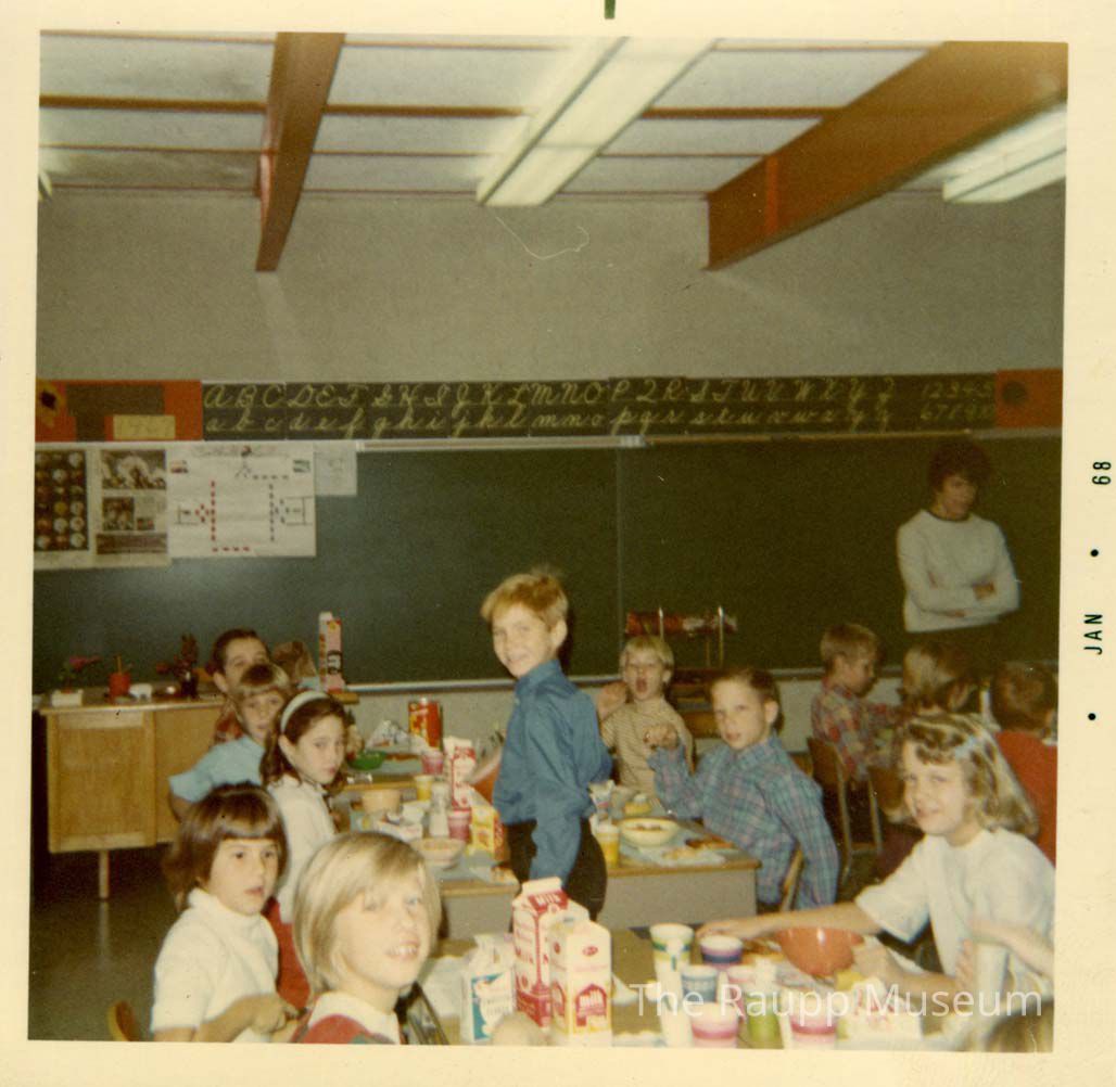 Color print with white border. Photo of children seated in two rows of tables eating in a classroom at Alcott School. Boy in blue shirt near middle of photo with green chalkboard and teacher in background. Dated on right border: "Jan 68." Back of photo indicates that the event is "Mrs. Moor's breakfast." Printed on Kodak paper.Made/Created