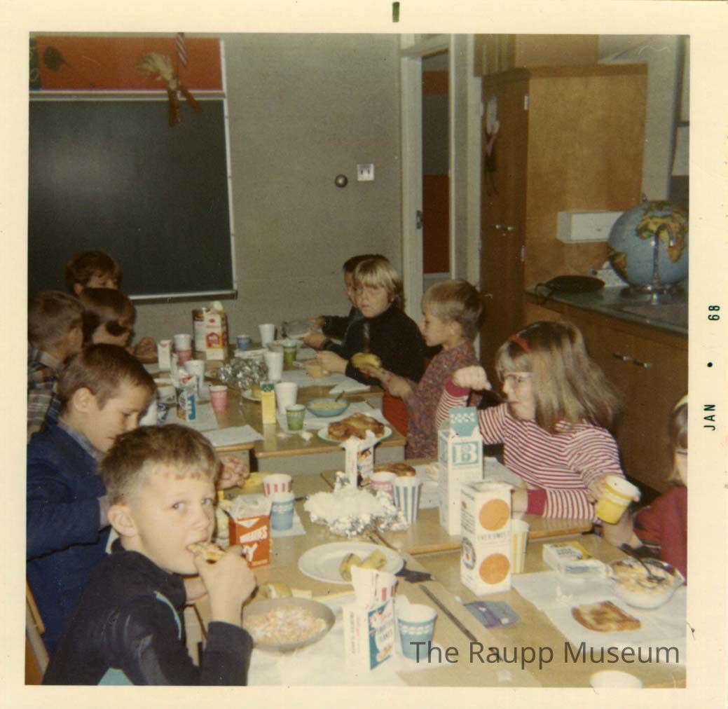Color print with white border. Photo of children seated facing each other eating breakfast in a classroom at Alcott School. One boy in the bottom left corner of the photo is looking at camera. Green chalkboard and globe in the background. Right border dated "Jan 68." Back of photo indicates that the event is Mrs. Moor's breakfast. Printed on Kodak paper.Made/Created