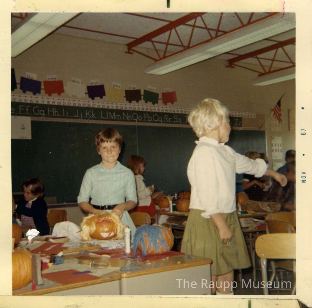 Color print with white border. Image of a classroom and students decorating pumpkins at Alcott School. Photo of a girl in a white blouse and khaki skirt and girl in a blue blouse. Dated on right border "Nov 67." Printed on Kodak paper.Made/Created
