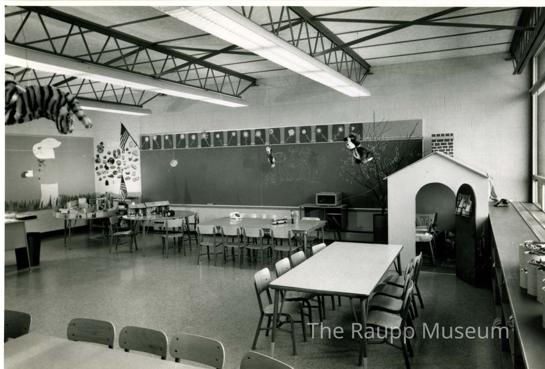 Black and white print with a white white border. Image of an empty classroom at Alcott School. Two round tables and three rectangular tables with chairs arranged around all of them. Full length blackboard in the background with and a row paper flowers above it. Stuffed tiger hanging from the ceiling near the upper left photo corner.Made/Created