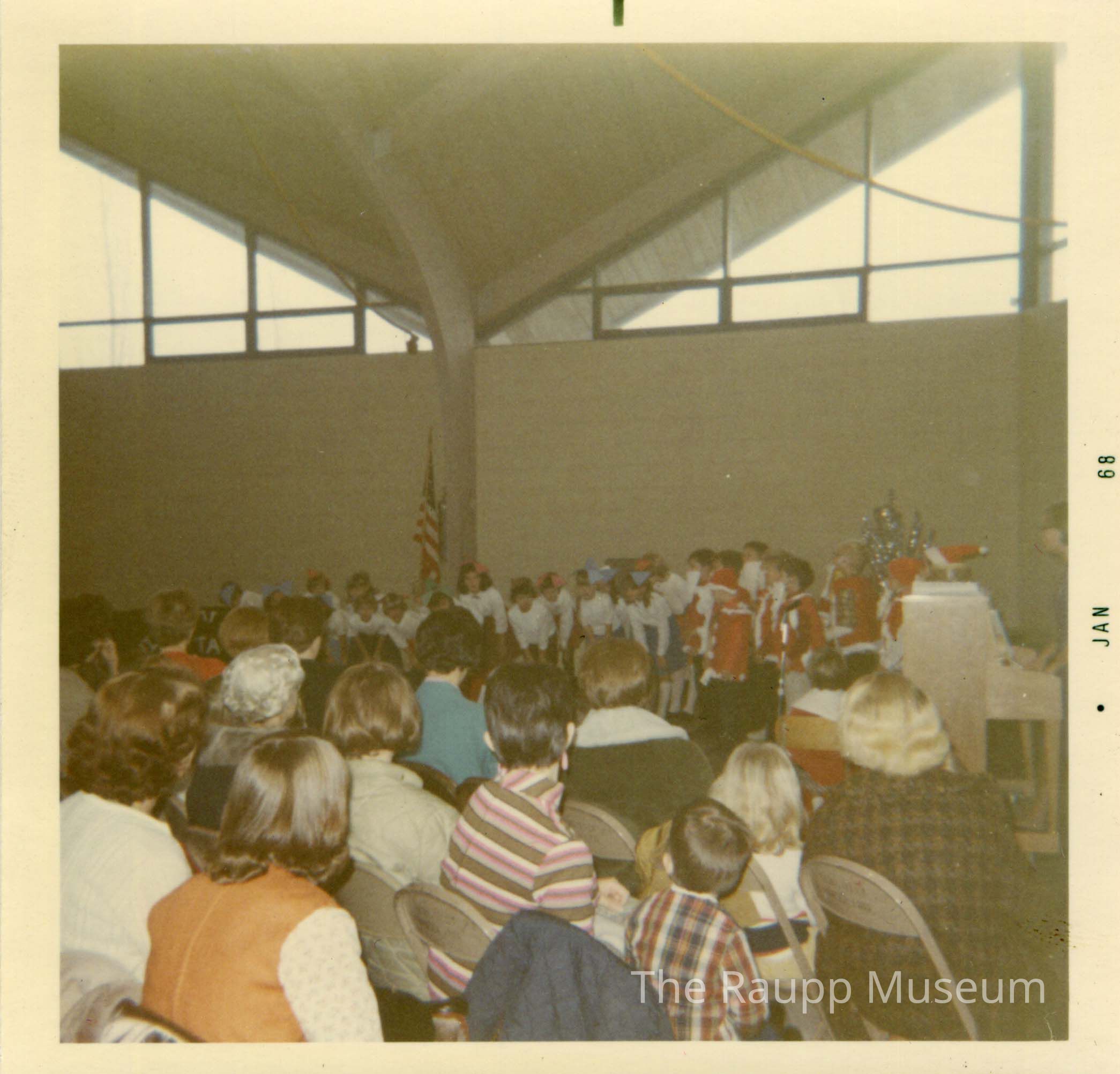 Color print with white border. Photo of children standing in rows giving a concert in the gymnasium at Alcott School. Children wearing white shirts and hair bows or red shirts and red hats. Audience seated with backs towards camera. Woman with tan vest seated nearest the camera in the bottom left corner of photo. Dated on right border: "Jan 68." Printed on Kodak paper.Made/Created