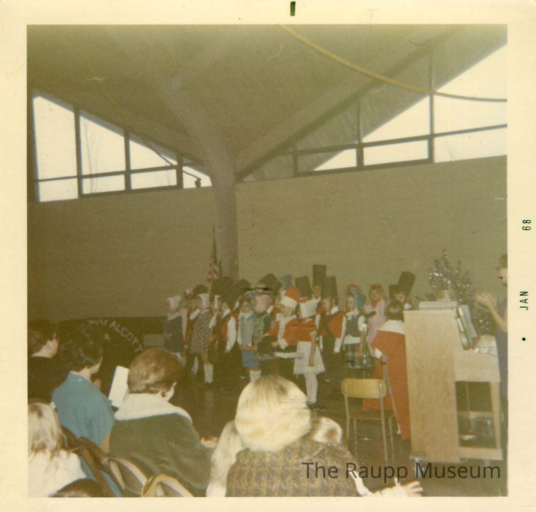 Color print with white border. Photo of children standing in rows, giving a concert in the gymnasium of Alcott School. Children wearing tall black hats and white bonnets. Audience seated with backs towards camera. Woman in purple dress clapping and standing behind a piano on far right side. Dated on right border: "Jan 68." Printed on Kodak paper.Made/Created