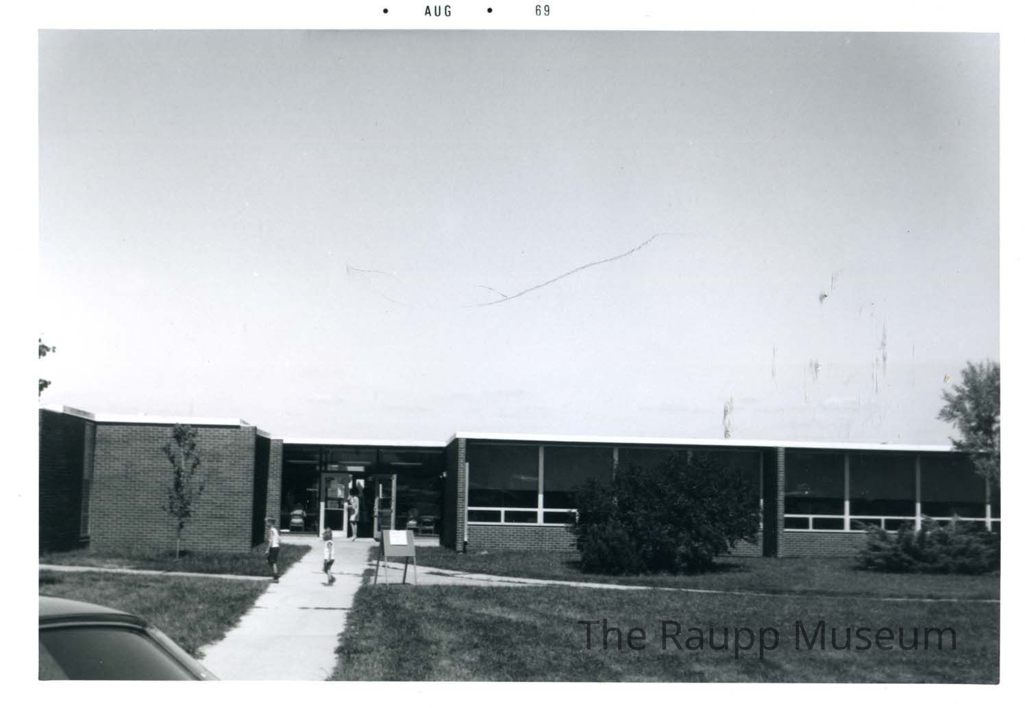 Black and white print with white border. Photo of the exterior entrance to Alcott School with two small children on the sidewalk in front of the building. Composition of photo is half sky, half building and grass. Printed on Kodak paper.Made/Created