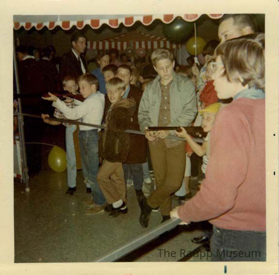 Square color snapshot with white border. Image of children shooting guns indoors at the Alcott School Fun Fair or perhaps but unlikely Buffalo Grove Day booth at the Park District. Printed on Kodak paper.Made/Created