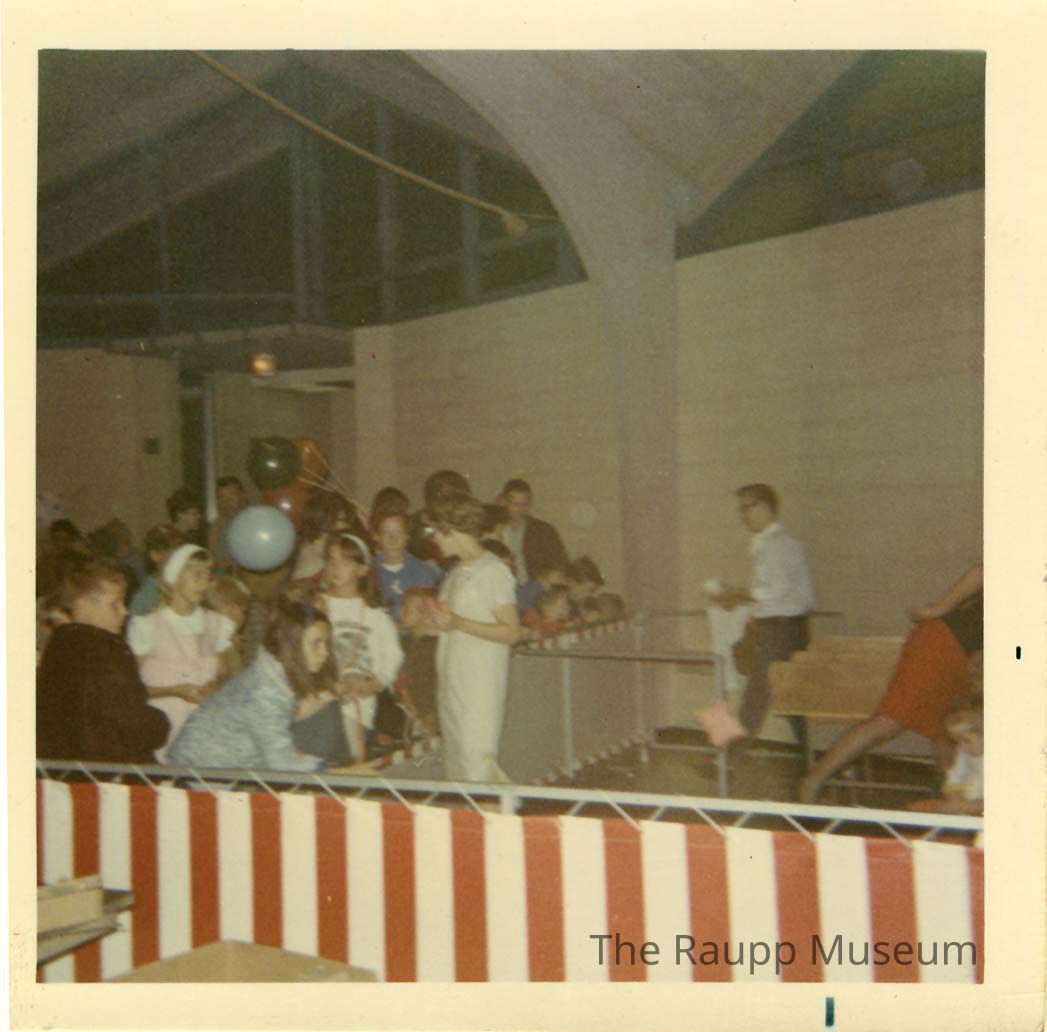 Color print with white border. Photo of people standing behind a red and white stripe divider in the gymnasium at Alcott School. Most prominent is a woman in a white dress near middle of the photo. Back of photo indicates the event was the school's Fun Fair in October 1967. Photo is dark and blurry. Printed on Kodak paper.Made/Created