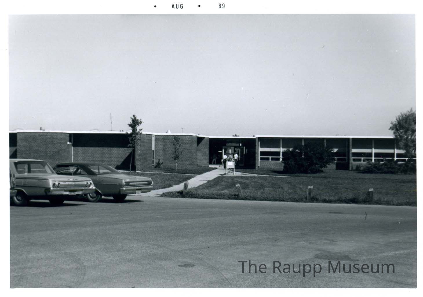 Black and white print with white border. Photo of the exterior entrance to Alcott School and parking lot. Group of people entering the building. Two cars on far left of the photo in the parking lot. Composition of the photo is half sky, half building and parking lot.Made/Created