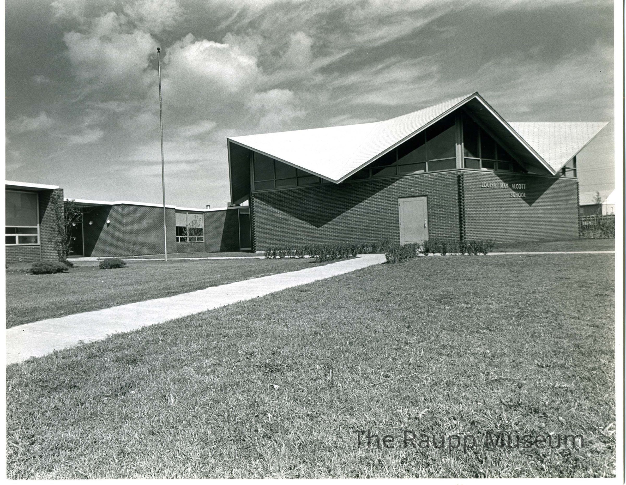 Black and white print with white border of the exterior of the Buffalo Grove Park District building when it was Alcott School. Printed on Agfa paper.Made/Created