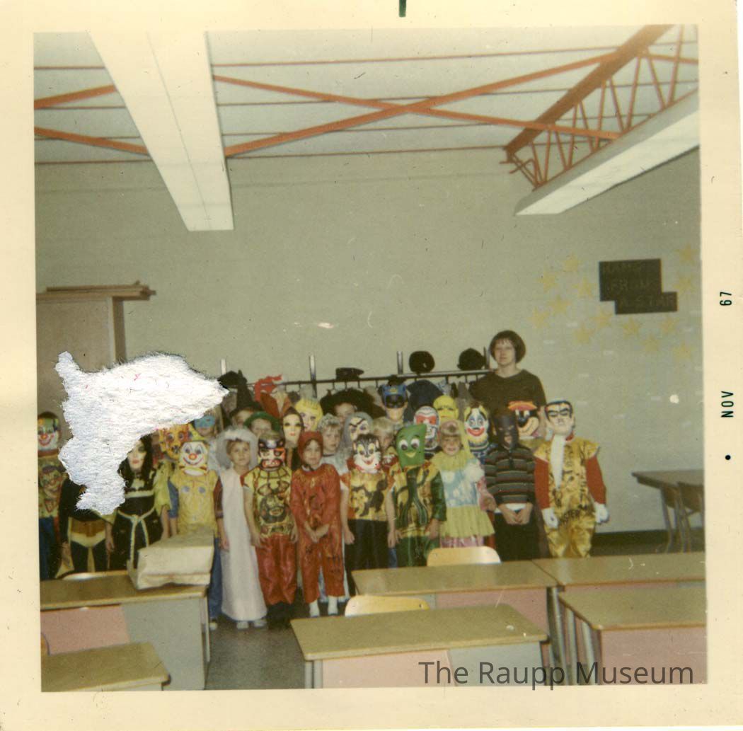 Color print with white border. Photo of children in Halloween costumes standing in three rows behind rows of tables at Alcott School. Teacher not in costume standing on right. Back of photo indicates that people are Mrs. Verhelst and her first grade class having Halloween fun. Dated on right border: "Nov 67." Printed on Kodak paper.Made/Created