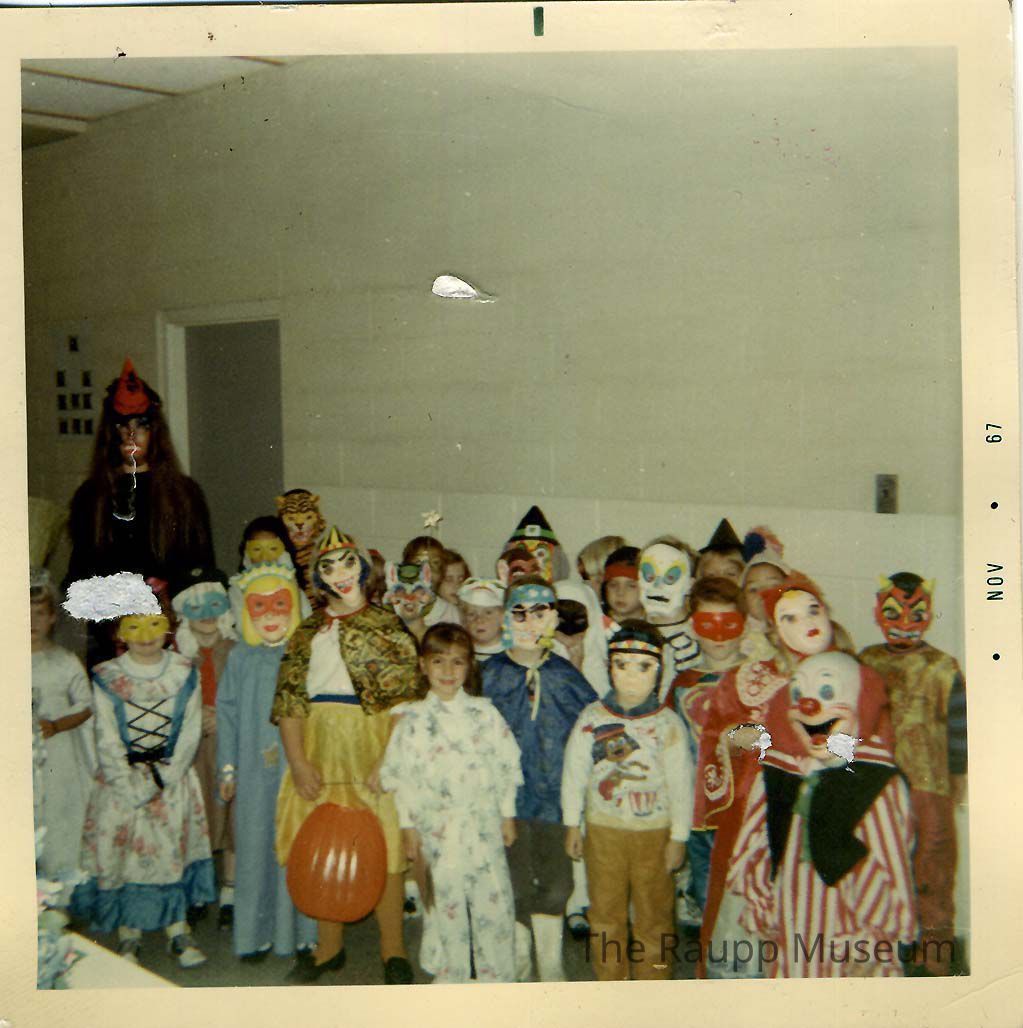 Color print with white border. Photo of group of children standing in rows in Halloween costumes with teacher also in costume. Back of photo indicates people pictured are Miss Cromer and her kindergarten class at Alcott School. Dated on right border: "Nov 67." Printed on Kodak paper.Made/Created