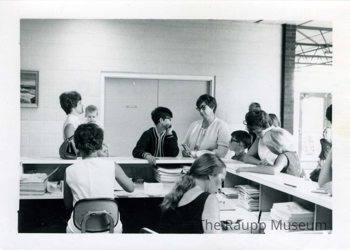 Black and white photo with white boarder. Image of two women (one wearing black and one wearing white) sitting behind a desk in the main administration area. Other women and children standing on the other side of the desk filling out papers. Printed on Kodak paper.Made/Created