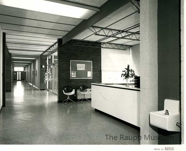 Black and white print with a white border. Image of what appears to be the main hall of Alcott School. The front desk is at the right of the photo with two chairs to the left of the desk. A water fountain is in the foreground in front of the desk. The main doors are in the background with an American in a stand next to them.Made/Created