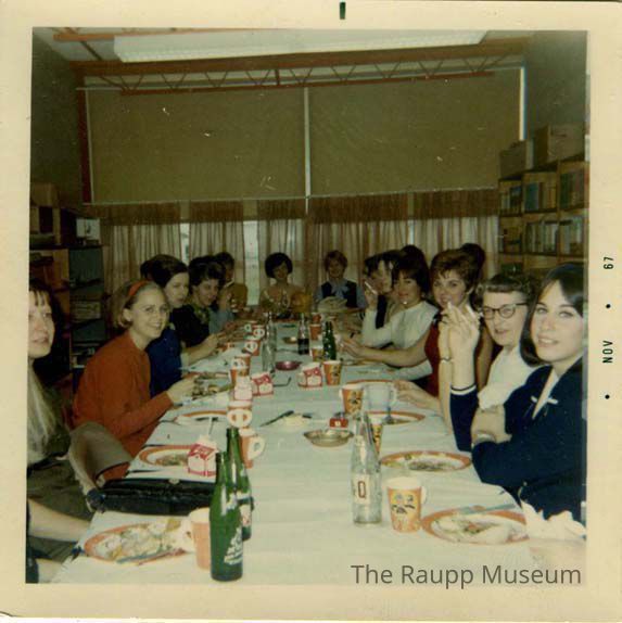 Color snapshot of women seated around a long, rectangular table during a meal with some of the women smoking. Dated on right border "Nov 67." Printed on Kodak paper.Made/Created