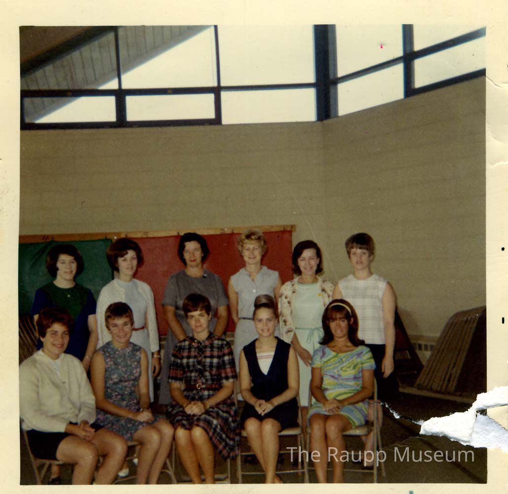 Color print with white border. Photo of group of women seated and standing in two rows under a window in Alcott School. Back of photo indicates these are new teachers and their names are written in pencil. With additional card with their names written in black ink accompanies photo. Printed on Kodak paper.Made/Created