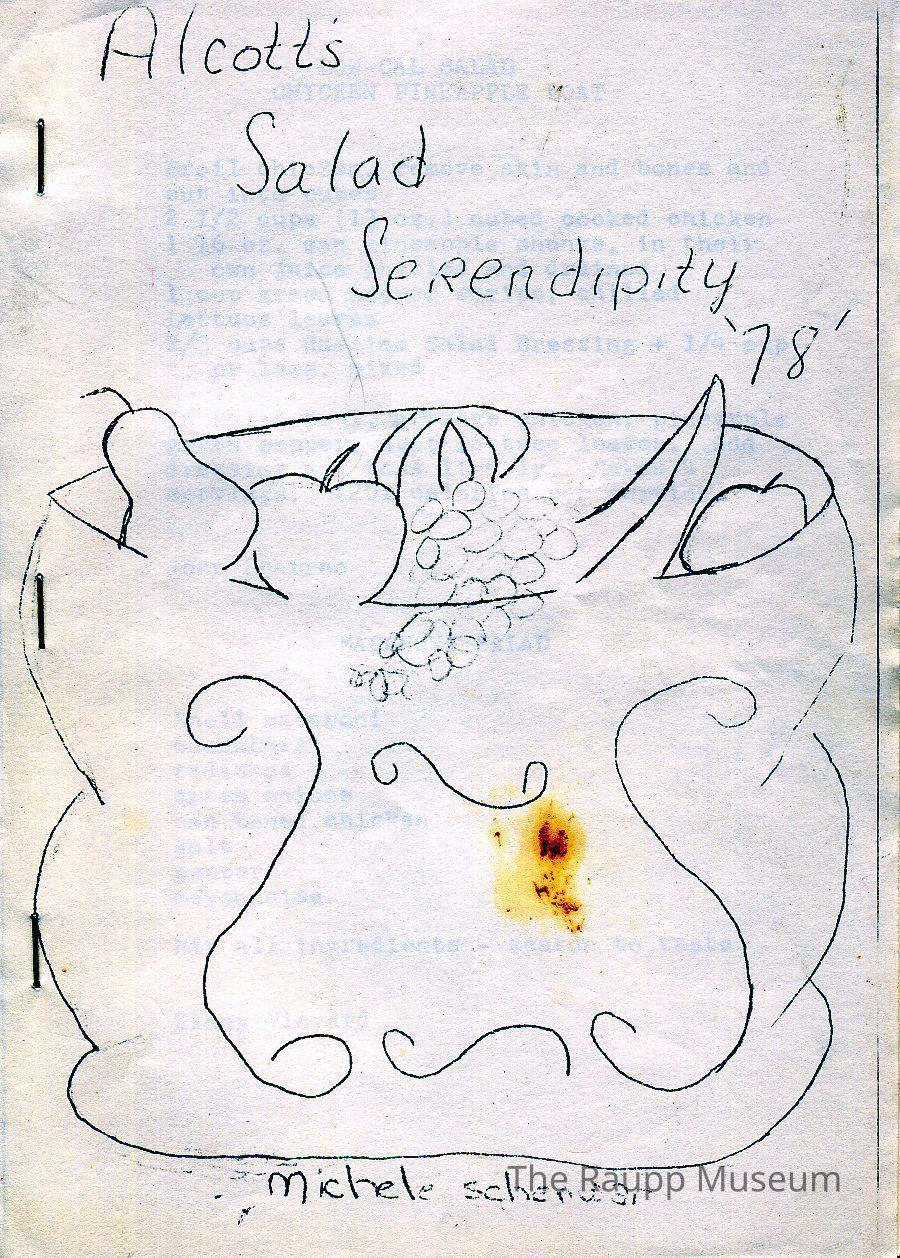 White typing paper booklet with staple binding. Cover has a black and white fruit bowl drawing on it with the name "Michele Schenwar" underneath. Booklet is a hand-assembled collection of salad recipes entitled "Alcott's Salad Serendipity '78." Recipes are typed in black ink and have the name of the contributor typed underneath.