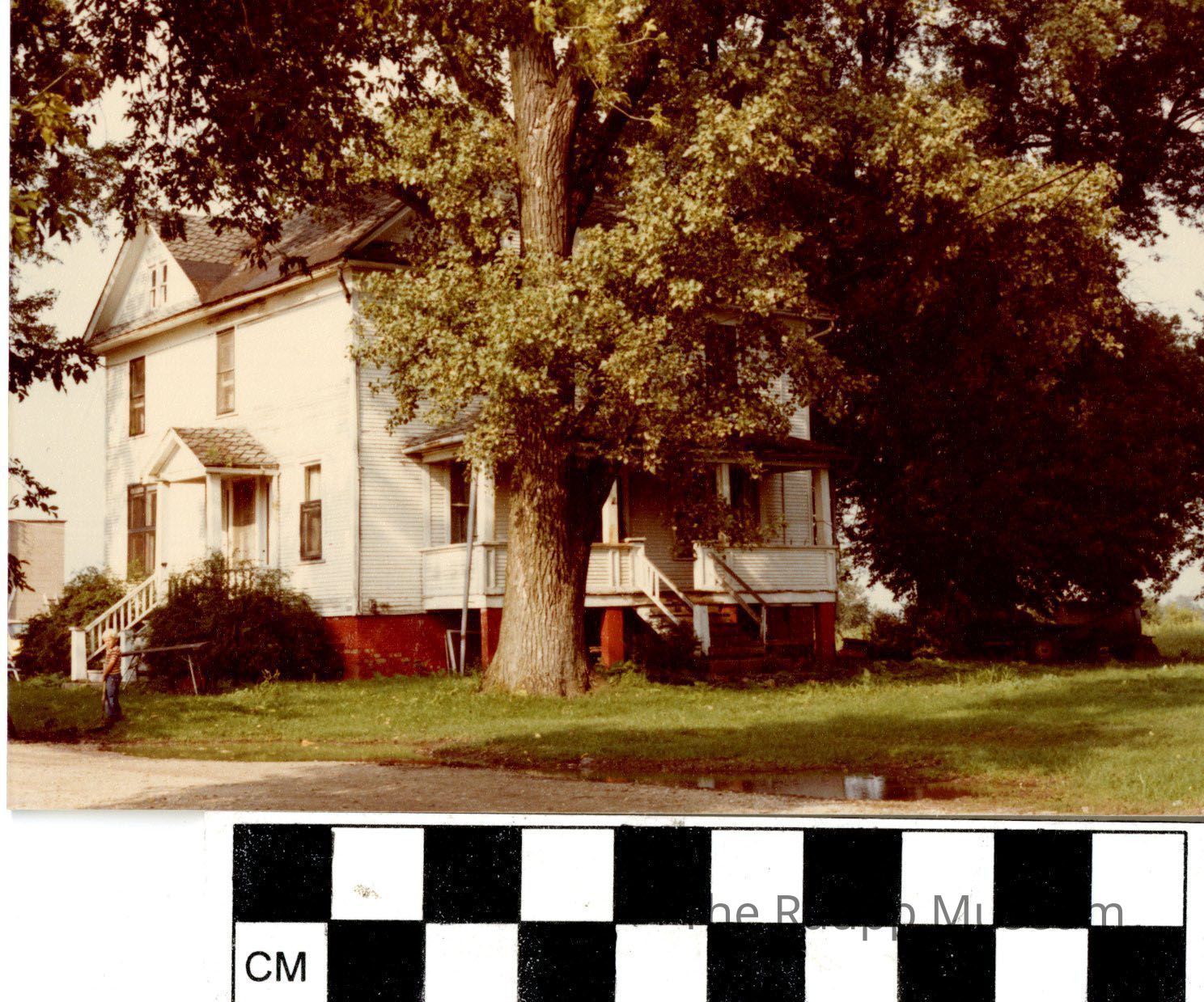 One (1) color photograph of a two-three story white home with multiple entrances, and red brick foundation: Alex Bunton Farm on on Busch Road. In front of the house is a large tree, with trees on the right and a tractor under it. There is a young boy standing on the left in red and white stripped shirt and blue pants. There is a building in the back left corner.