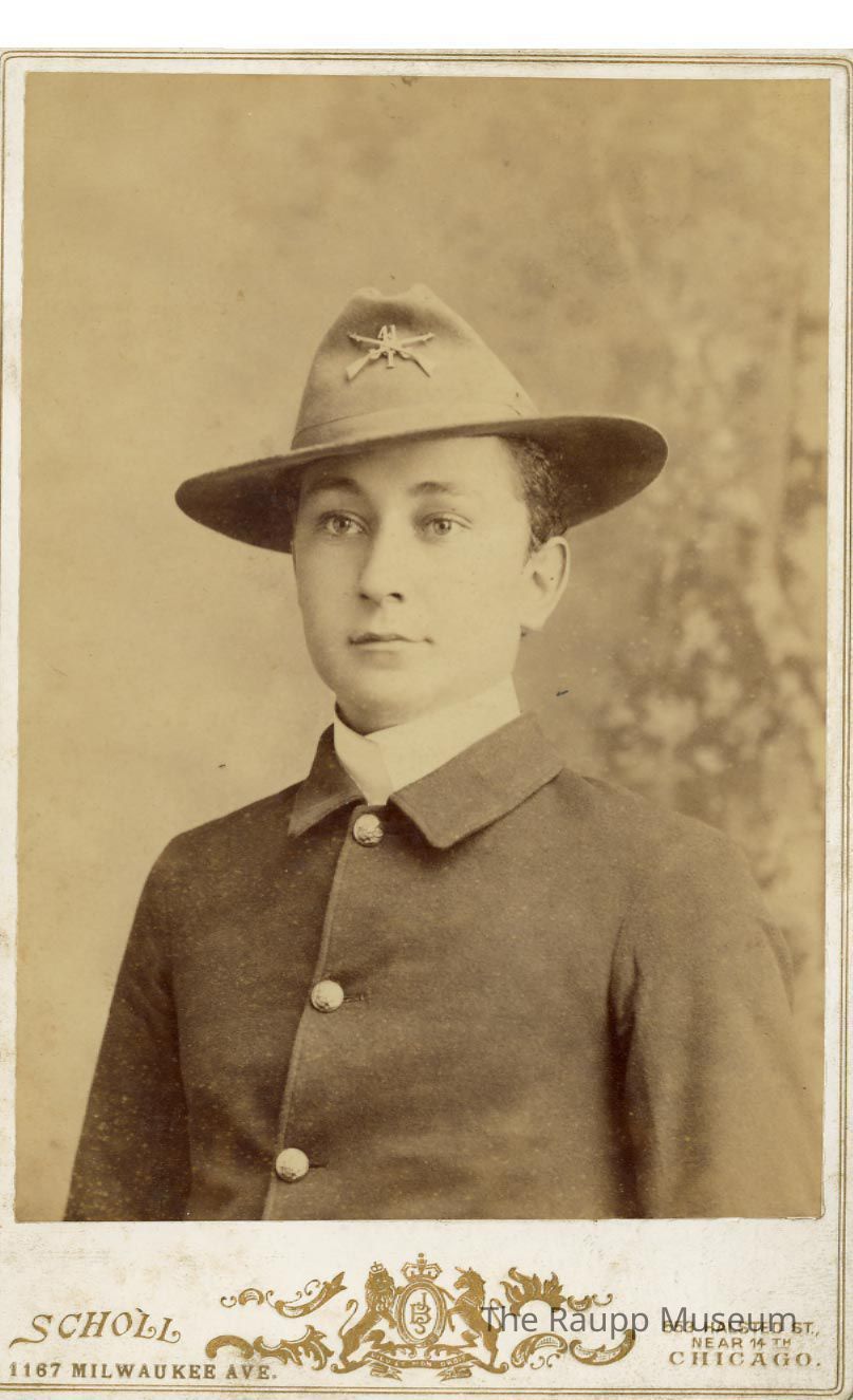 One (1) black and white sepia toned professional photo. Image of a young man from the waist up in military uniform. The back has handwritten "Aloisiur Beker" written in pencil. The man is wearing a buttoned-up dark colored coat and white shirt underneath. He has a hat with a straight brim cap, with a pin of two guns making an "x" on the front. The photo is on a white mat that is embossed with gold lettering: " Scholl 1167 Milwaukee Ave., 533 Halsted St. near 14th Chicago. The back has written in brown: "From J.B. Scholl, Halsted No. 553 Near 14th, Chicago. Duplicates can be had at any time." There is also a logo with an eagle, drum, sword, and gun behind an American flag on the back of the photo.Dimensions