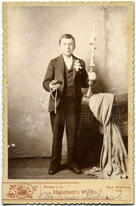 Black and white glossy print mounted to a white mat board with deckled edges. Professional studio information stamped on the card under the image. Portrait image of young Aloisus Becker. He is wearing a three-piece suit with white bowtie and is holding a rosary and tall candle stick. With blank backdrop and blanket drapped over an upholstered table on the right.Dimensions