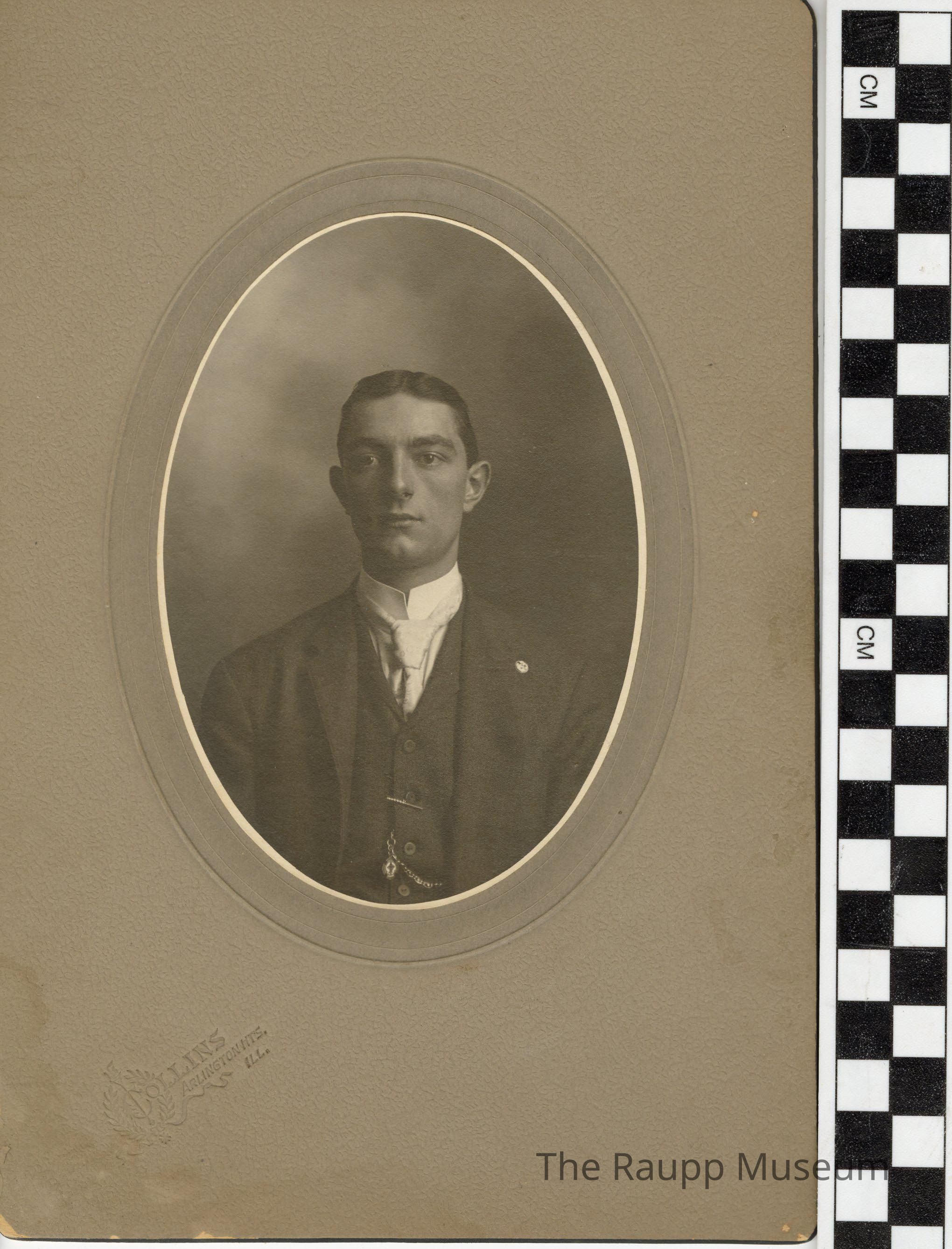 One (1) black and white oval photograph of Aloys (Alois) Weidner (Brother Wundibald). The portrait is from his waist up and Aloys is wearing a three piece black suit with white undershirt and white tie. He has a round pin on his left breast, and a chain on his vest.