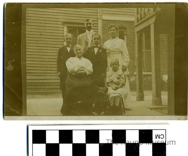 Yellowed photographic image printed on a postcard. Amateur photography image of a family of six with stone and wood sidings of a building behind them. A man, presumably Andrew Raupp standing in the center, with two boys wearing suits, and a woman in a white dress on the right. Seated in front is an older woman with arms crossed next to a girl with a sash. Postcard has wide vertical borders with thinner borders on three sides of the image. reverse side has printed postcard text, no stamp box. Handwritten text in ink: "And. Raupp Family and Mother; dated 9-3-1916"Dimensions