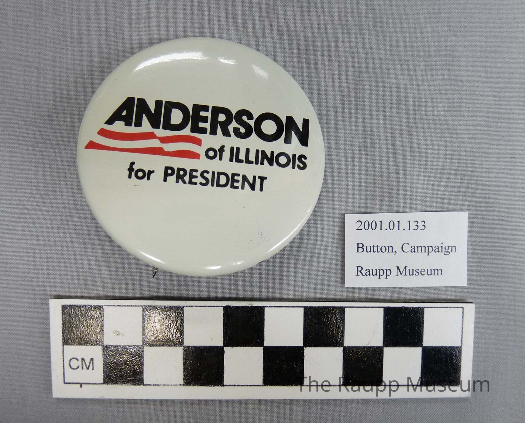 One (1) campaign button, with text "Anderson of Illinois for President". White button with black letters and red flag stripes. Back is silver metal with a metal pin. Small black logo with undecipherable writing on edge.