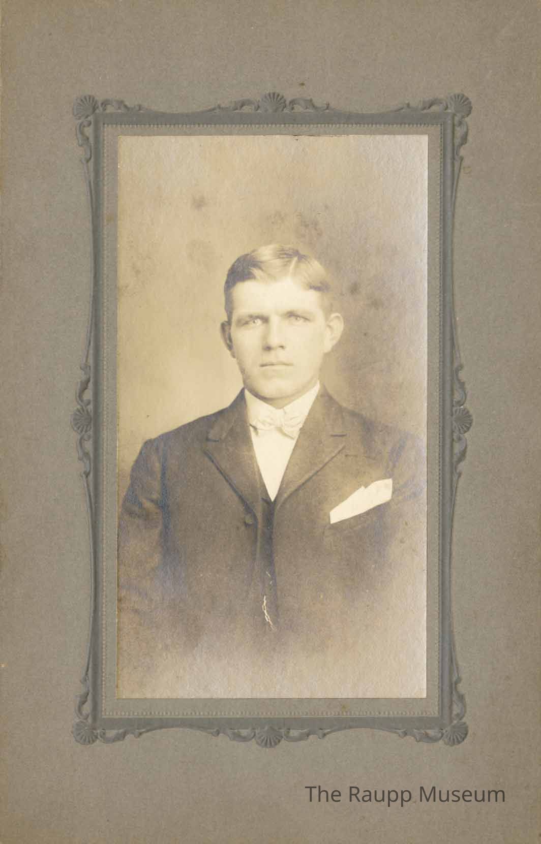 One sepia toned, black and white photograph, mounted onto a heavy brown cardboard frame. The photo is of Andrew Dusold, a profile picture from the waist up. He is wearing a black suit with a white undershirt and white bowtie. There is a white cloth in his coat pocket. His hair is parted on the left side of his head. He is wearing a chain on his jacket, visible in the middle of his coat. On the back is written "And. Dusold" and "1909".Dimensions