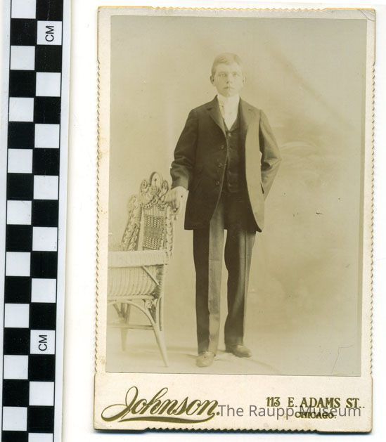 Black and white semi-glossy print mounted to a white card with deckled edges. Professional studio information embossed on the card under the image. Portrait image of young Andrew Dusold standing in front of a blank backdrop and resting his hand on a wicker chair. He is wearing an open suit jacket with vest with white necktie. His hair is straight and parted neatly. reverse side has ink inscription "Andrew Dusold."Dimensions