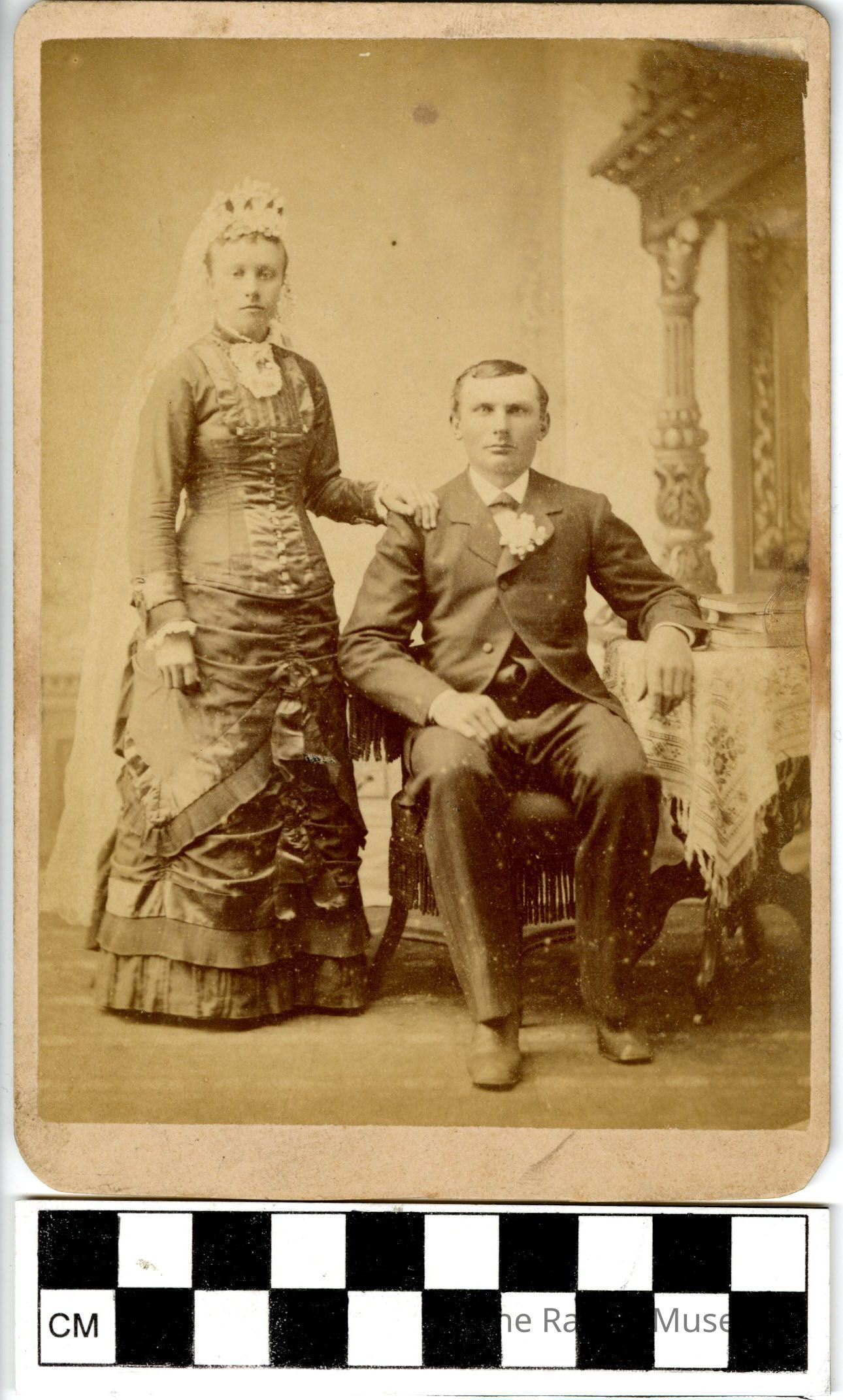 One (1) black and white photograph sepia toned, of Andrew Horcher and Rose Weidner on their wedding. On the left is Rose standing, with her left hand resting on Andrew's shoulder. She is wearing a black wedding dress with lots of layers in the front skirt, and a button down top piece with white frill at the neck. She has on a white veil that is floor-length. Andrew is seated on the right in a black chair, wearing a three piece black suit with white undershirt and black tie. He has a white flower boutonniere on his left lapel. His left arm is resting on a table with a white lace tablecloth. There is a pillar behind him on the right.