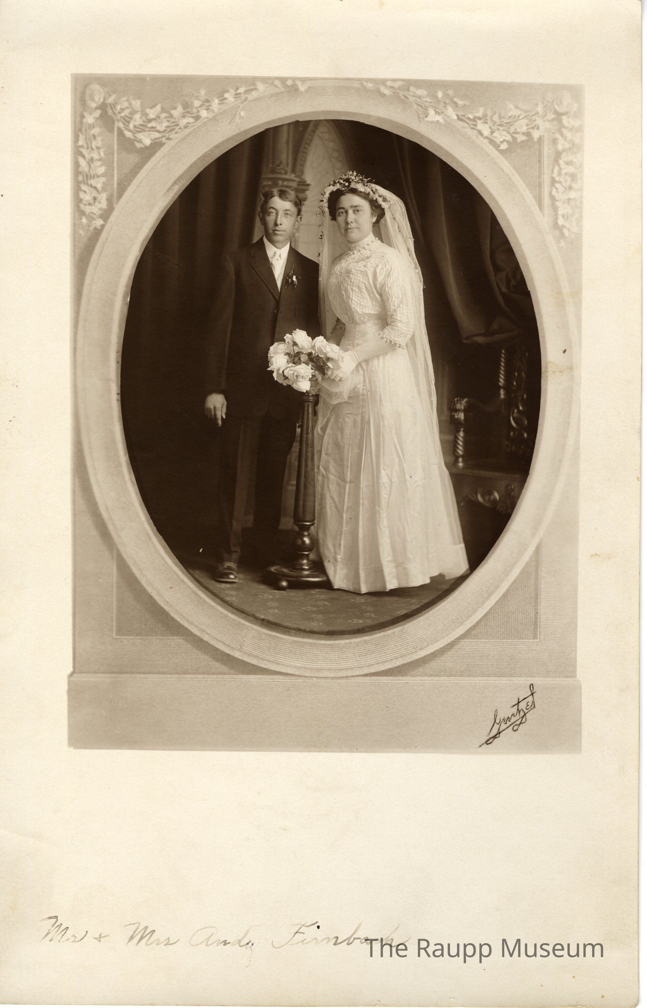 One (1) black and white wedding portrait photograph of Mae Weidner and Andrew J. Firnbach. This photo is one of two identical wedding portrait photographs (the other, P031B, is contained in a cardboard holder). Photo is round, with a printed white square border design with leaves in the top corners. Mae is on the right and in a white wedding dress, veil with silver crown and white flowers and gloves. The flowers are resting on a pedestal. Andrew is on the left in a black suit, white undershirt and tire, with boutonniere on left lapel. There is a seat on the right side and curtains behind. There is a signature in the bottom right corner "Gentzel".Dimensions