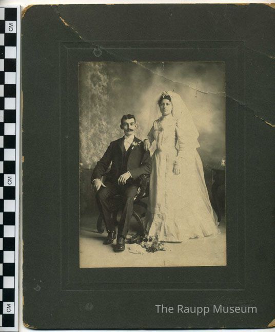 Image is a wedding portrait of Andrew Raupp and his wife. Man is seated on the left with a large moustache and ears wearing a three-piece suit and white bow tie. Bride wearing a high collar dress with long sleeves and lace trim near the ruffled hem. Her hand is resting on Andrew's shoulder. Bride's bouquet laying on the floor between them. With professional studio backdrop.Made/Created
