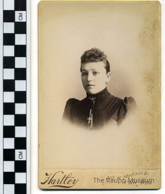 Black and white professional print mounted to a tan card. Studio information printed below the image on the card. Portrait image of Anna Dittrich. She is wearing a dark shirt with high collar and puffed sleeves. She has a crucifix chain pendant suspended from a thin brooch. Her hair is pulled back tightly with curls on top of her head. reverse side has photographer studio information and inscription: "Anna Dittrich; friend to Grandma Aunto to Alfred."Relationships